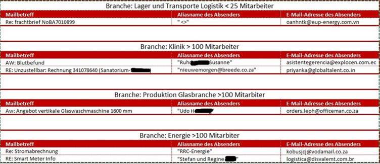 Die Betreffe und Inhalte der Angriffsmails scheinen verstärkt aus dem echten Mailverkehr der angegriffenen Firmen mit deren Kunden/Partnern zu stammen und täuschen perfekt tatsächlich stattfindende Vorgänge vor. Untenstehend ein paar Beispiele aus verschiedenen Branchen, herausgenommen aus dem Mailverkehr, welche in den letzten Tagen herausgefiltert wurden.
