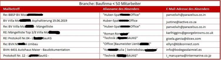 (Bild: Beispielmails zugesandt an einen Kunden aus der Baubranche. Die Betreffe stammen anscheinend aus dem Mailverkehr mit Kunden. Die Aliasnamen sollen vortäuschen, dass die E-Mails von Kunden bzw. von einem anderen Mitarbeiter des Unternehmens stammen.)